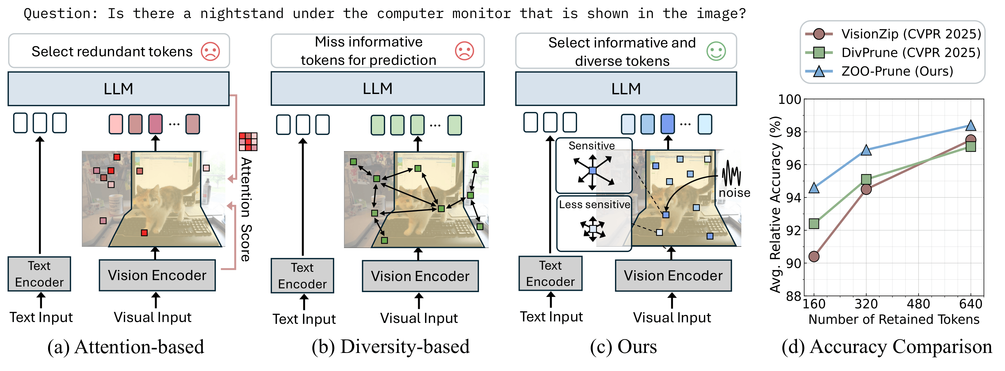 Large Vision-Language Models (VLMs) enable strong multimodal reasoning but incur heavy inference costs from redundant visual tokens. Token pruning alleviates this issue, yet existing approaches face limitations. Attention-based methods rely on raw attention scores, which are often unstable across layers and heads and can lead to redundant selections. Diversity-based methods improve robustness by selecting tokens far apart in feature space, but risk dropping regions needed for accurate prediction. We propose ZOO-Prune, a training-free framework built on the intuition that highly sensitive tokens have a stronger influence on the model's output and capture complementary visual cues rather than redundant ones. To achieve this, we estimate token sensitivity using zeroth-order perturbations at the lightweight projection layer. This measures how small random perturbations affect the projected features and enables efficient approximation of each token's influence without backpropagation. Extensive experiments across multiple VLMs and benchmarks show that ZOO-Prune consistently outperforms prior methods while pruning up to 94.4% of tokens without sacrificing accuracy. Our method also improves efficiency, reaching up to 2.30x faster end-to-end inference compared to the baseline.